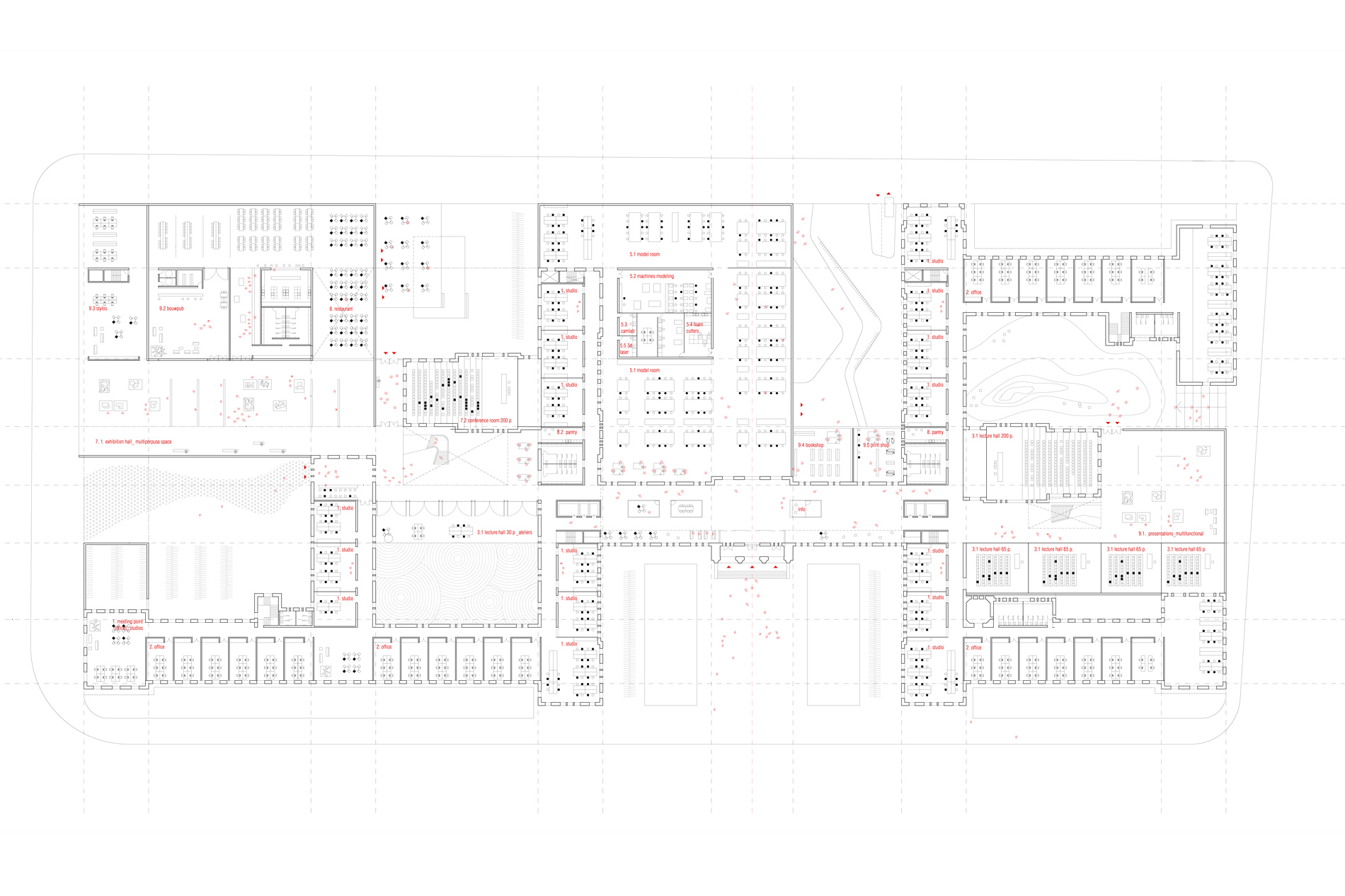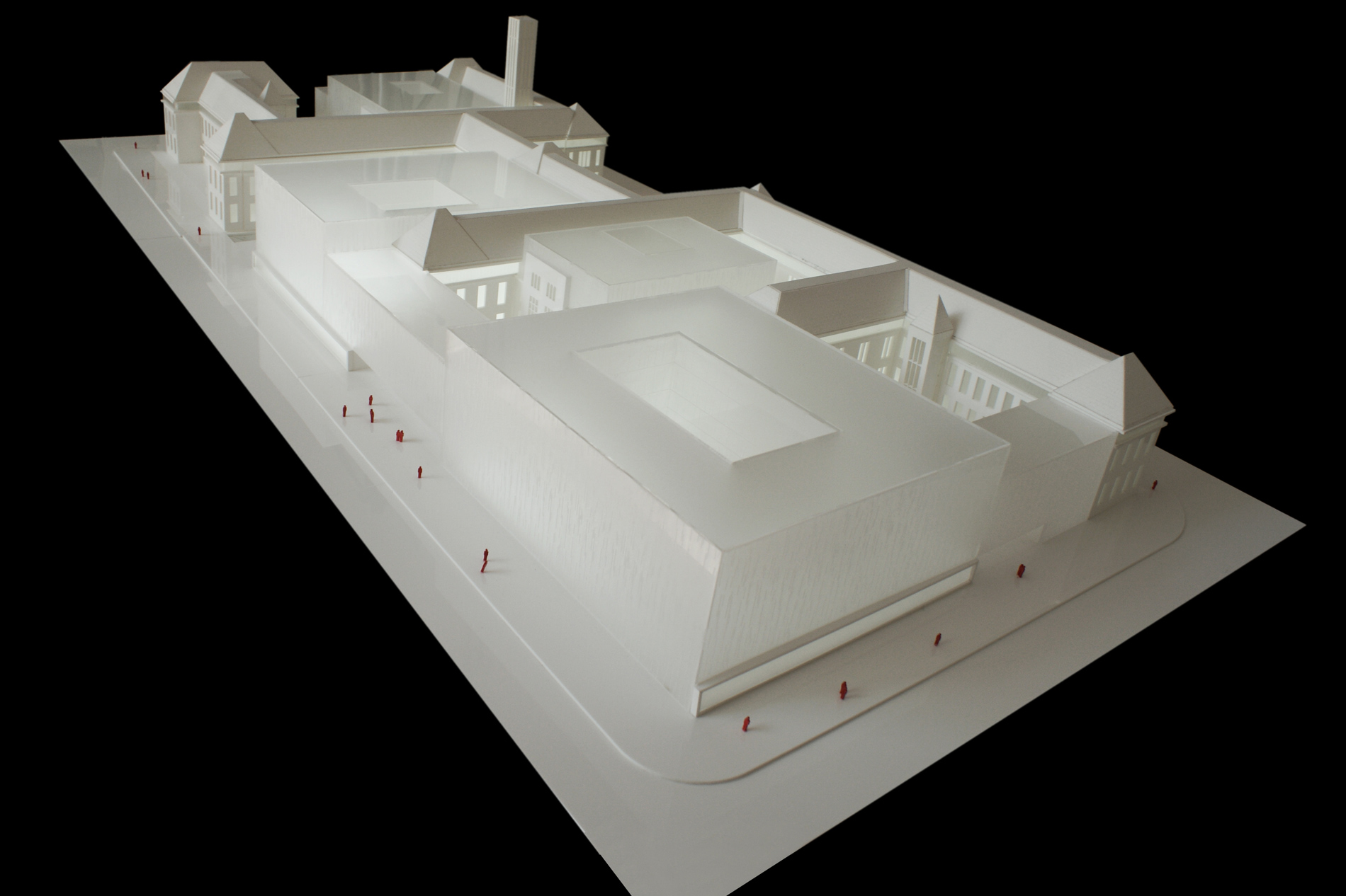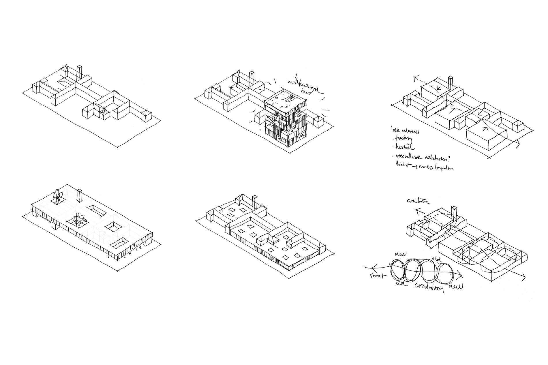 The programmatic organisation is clear and, by avoiding dead ends and disorientation, helps to overcome the labyrinth-like character of the existing building. This is achieved by organising all public functions along one street and by positioning the studio spaces and offices in the transversal wings.