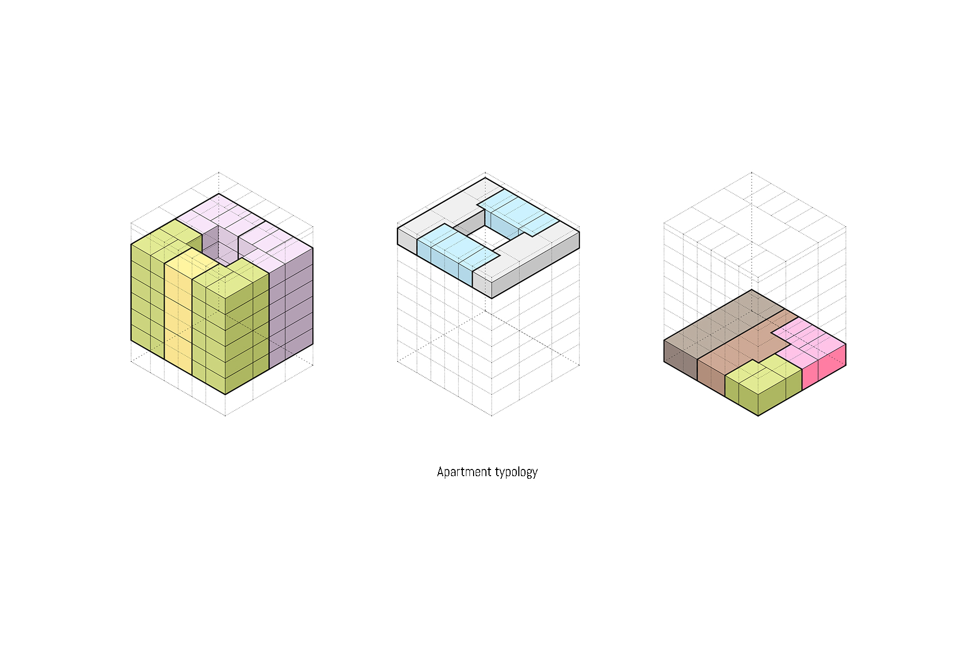 A very clear grid organizes the units in a symmetrical way. This grid allows combining four 3room apartments in one floor or six 2room apartments, without altering the clear rhythm in the facade.