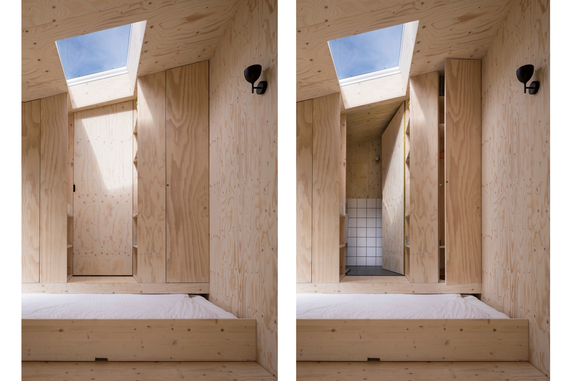 On the inside, the bathroom and the studio room are separated with a wooden custom-made closet. Under the compact bathroom, a pullout bed is located.