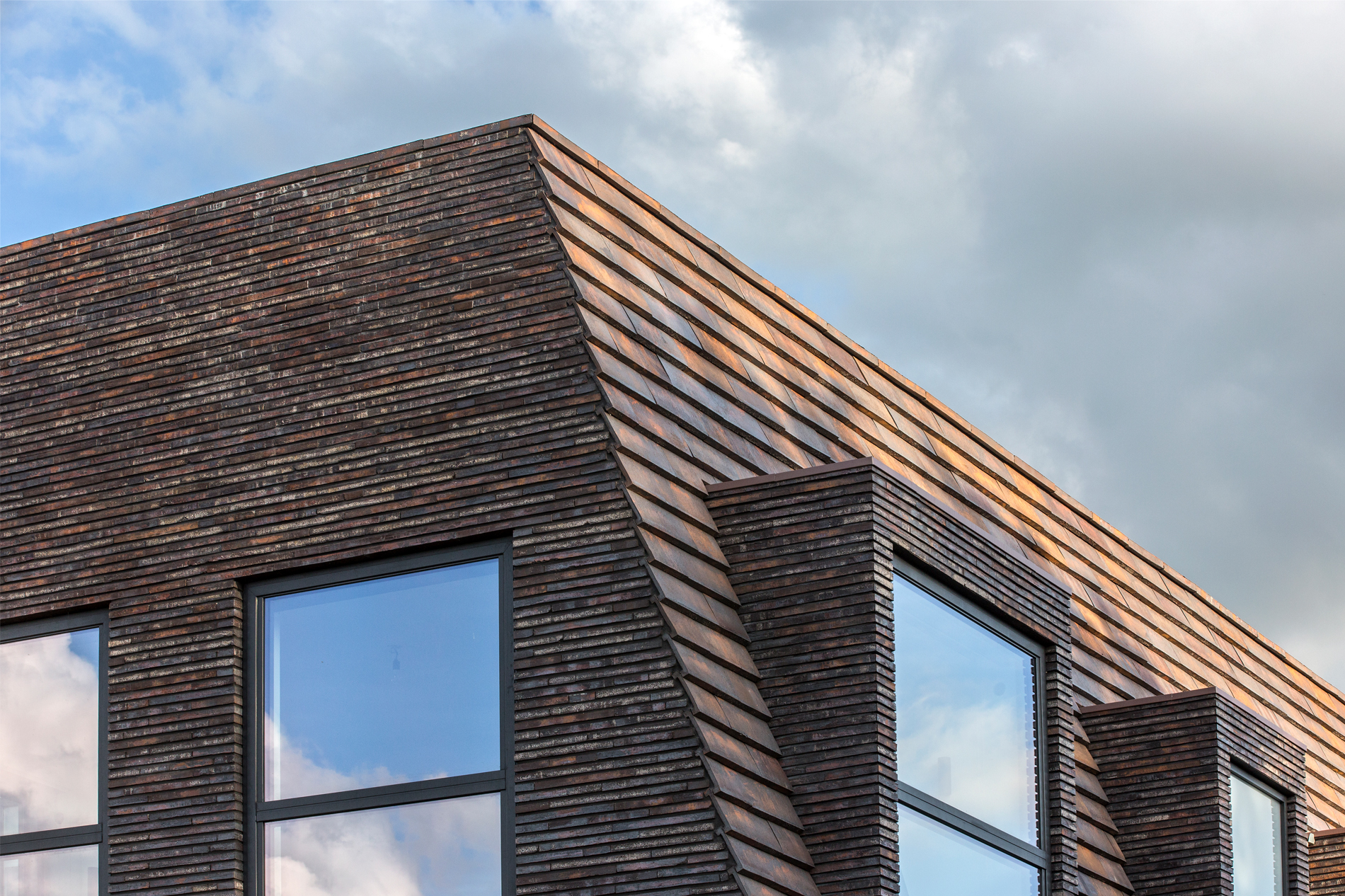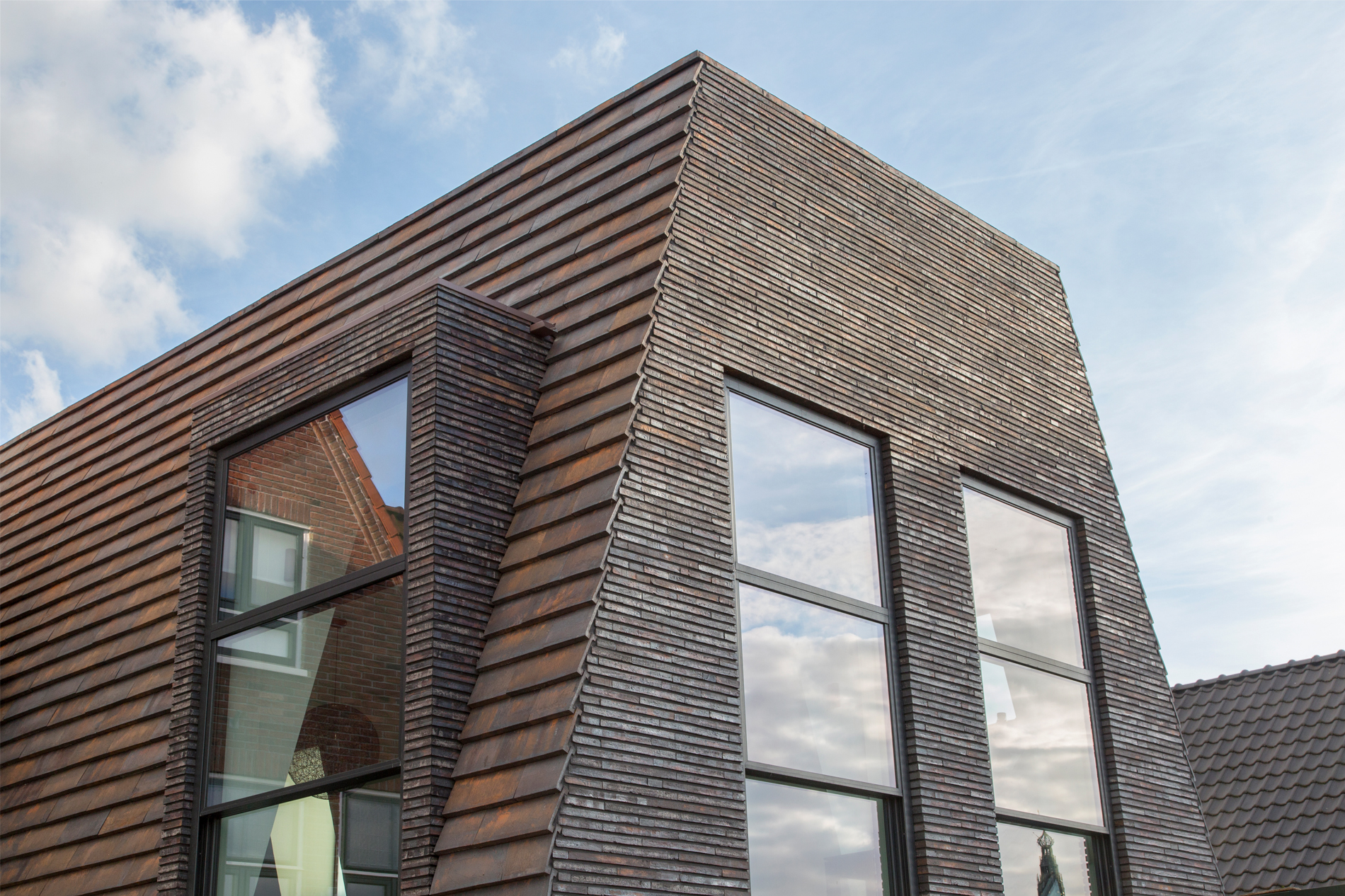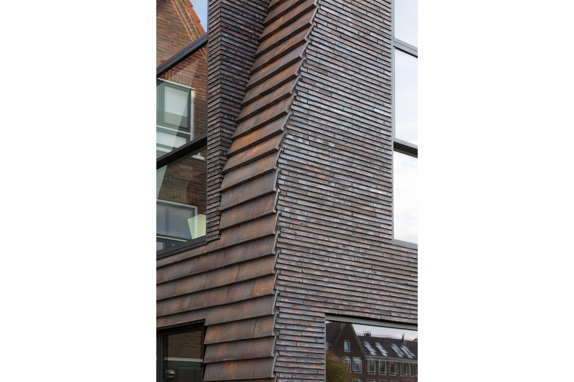 We chose hand made bricks and hand made ceramic roof tiles (Petersen) for the materialization of the new volume.