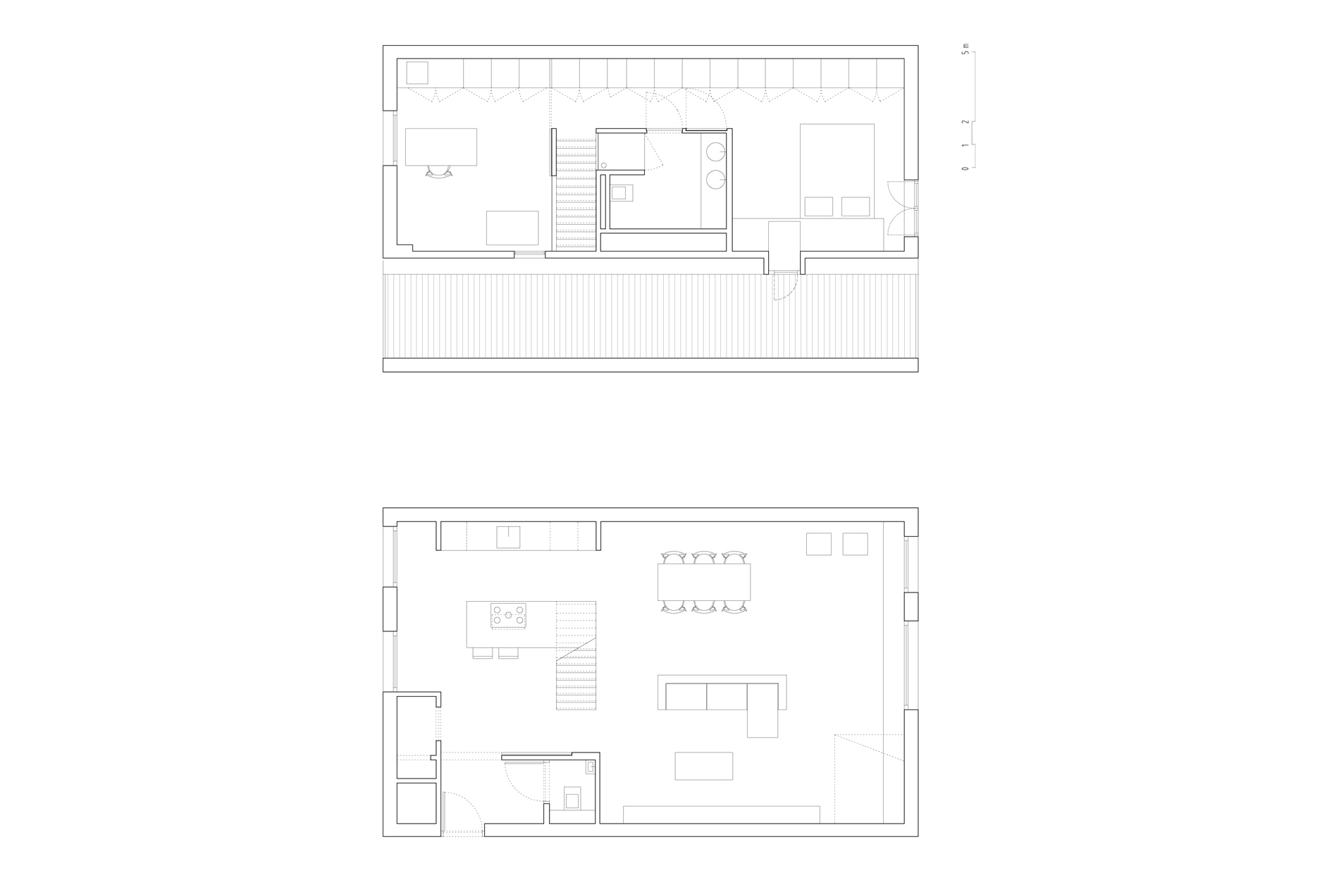 On the upper floor the guest room and the main sleeping room can be found. Both spaces are experienced as one large room that can be split into two in case needed.