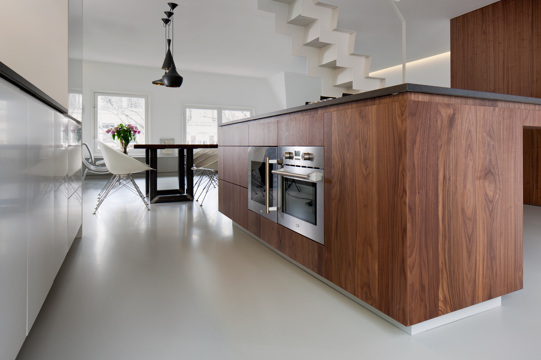 The main idea of the project was to transform the dark and claustrophobic existing apartment into a bright and spacious loft. The 70 m2 living area is located on the first floor. It is conceived as a continuous space capable of hosting different living activities without fragmenting them into separate rooms. An oak gray painted window bench provides a seat to enjoy the beautiful view towards the Amsterdam canals. Furthermore, this window bench functions as a storage cabinet. A walnut wood sliding door creates the possibility to close off the entrance hall from the living space.