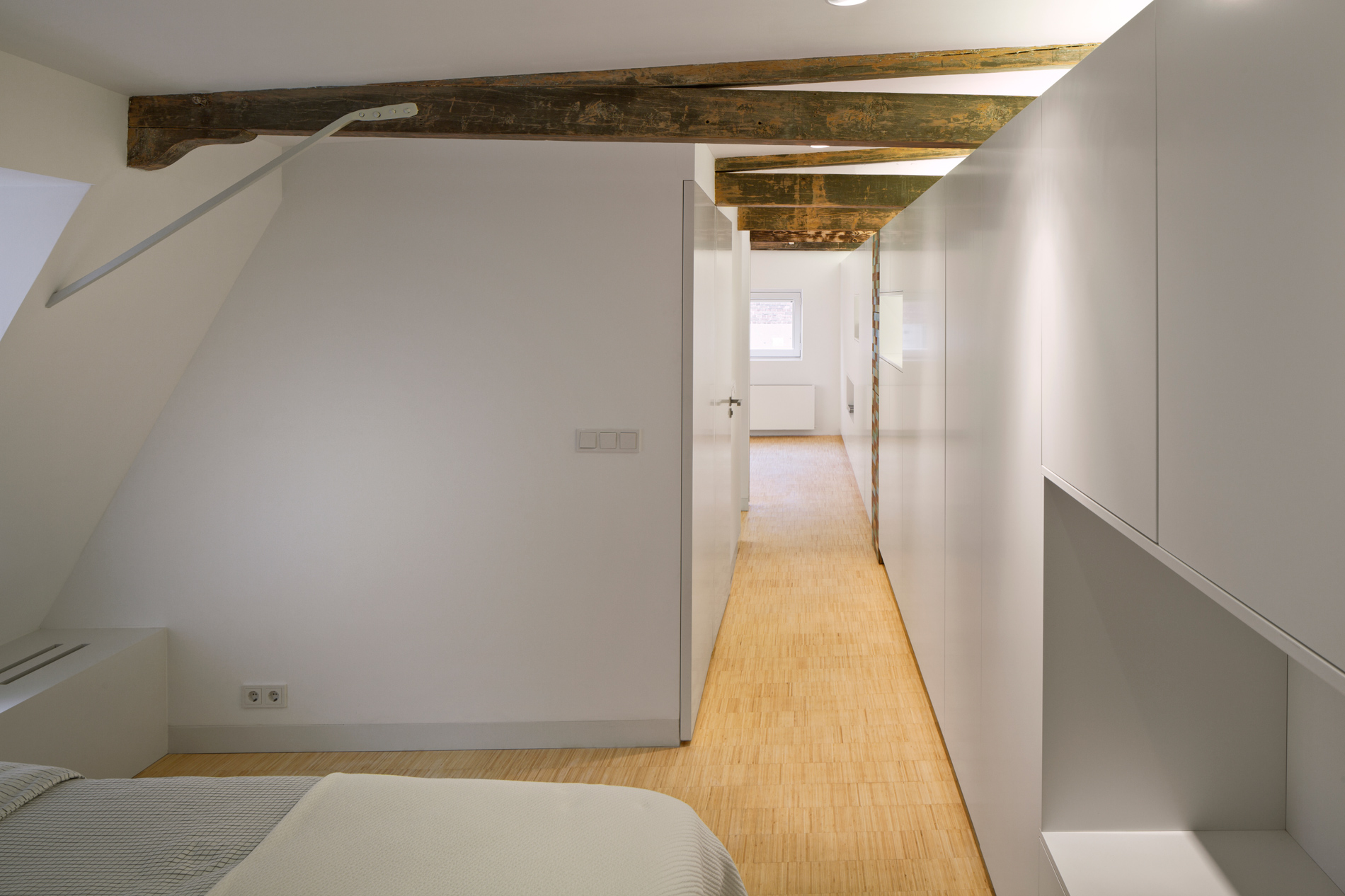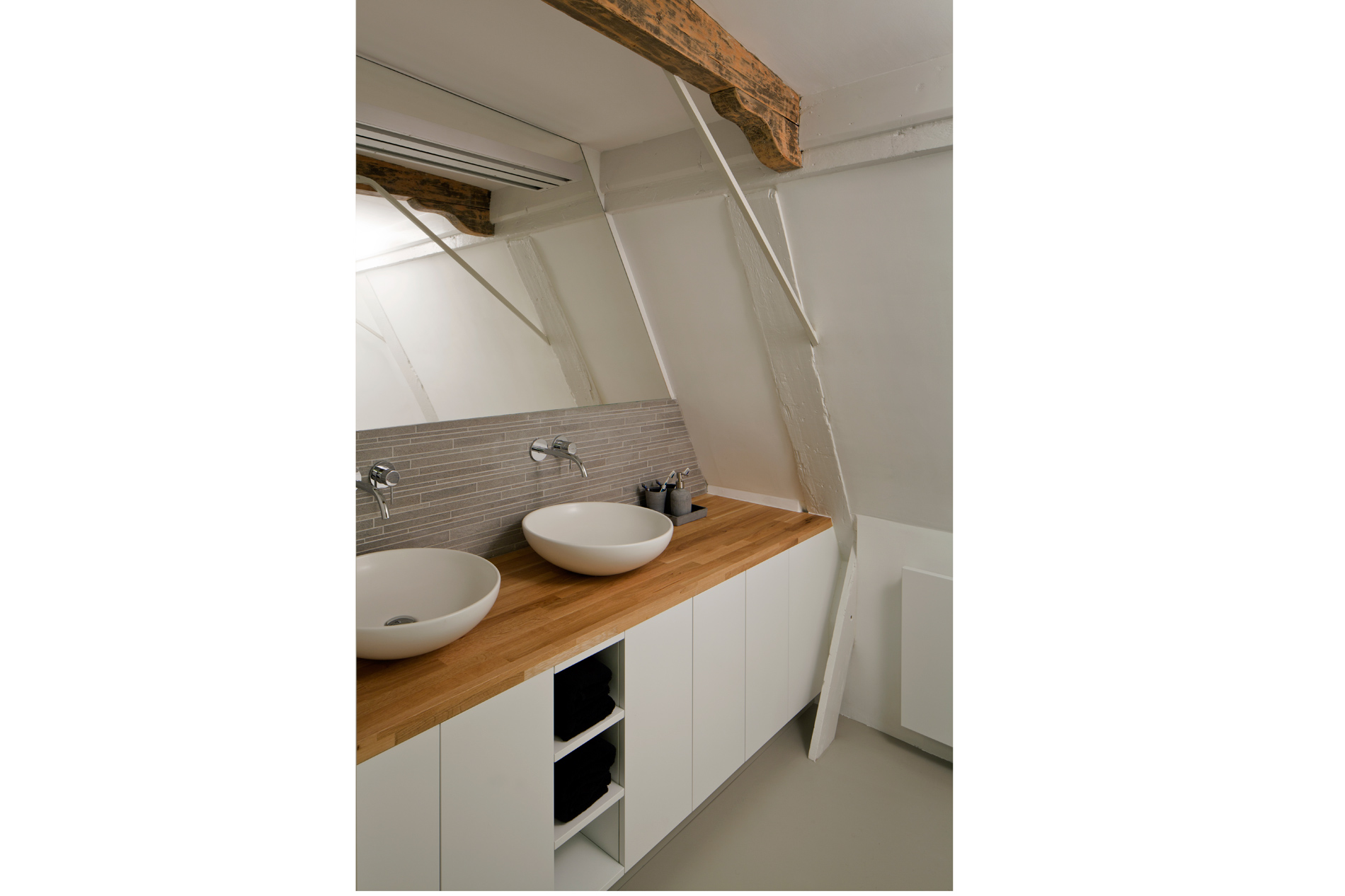 The bathroom is situated in between these two rooms. Existing plaster walls have been removed in order to make the old roofbeams visible.