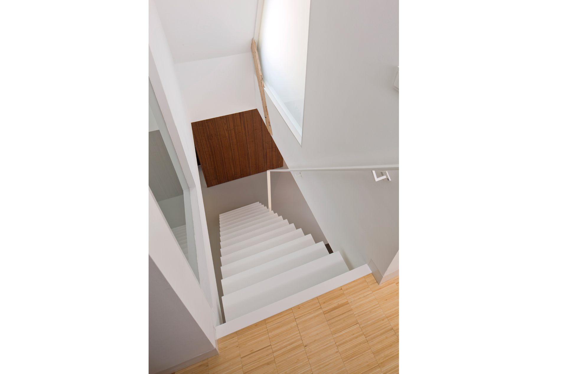 A light steel staircase creates the transition between cooking and dining area. Moreover a series of satin glass walls have been incorporated in the upper floor to bring natural light into the lower level and the bathroom.