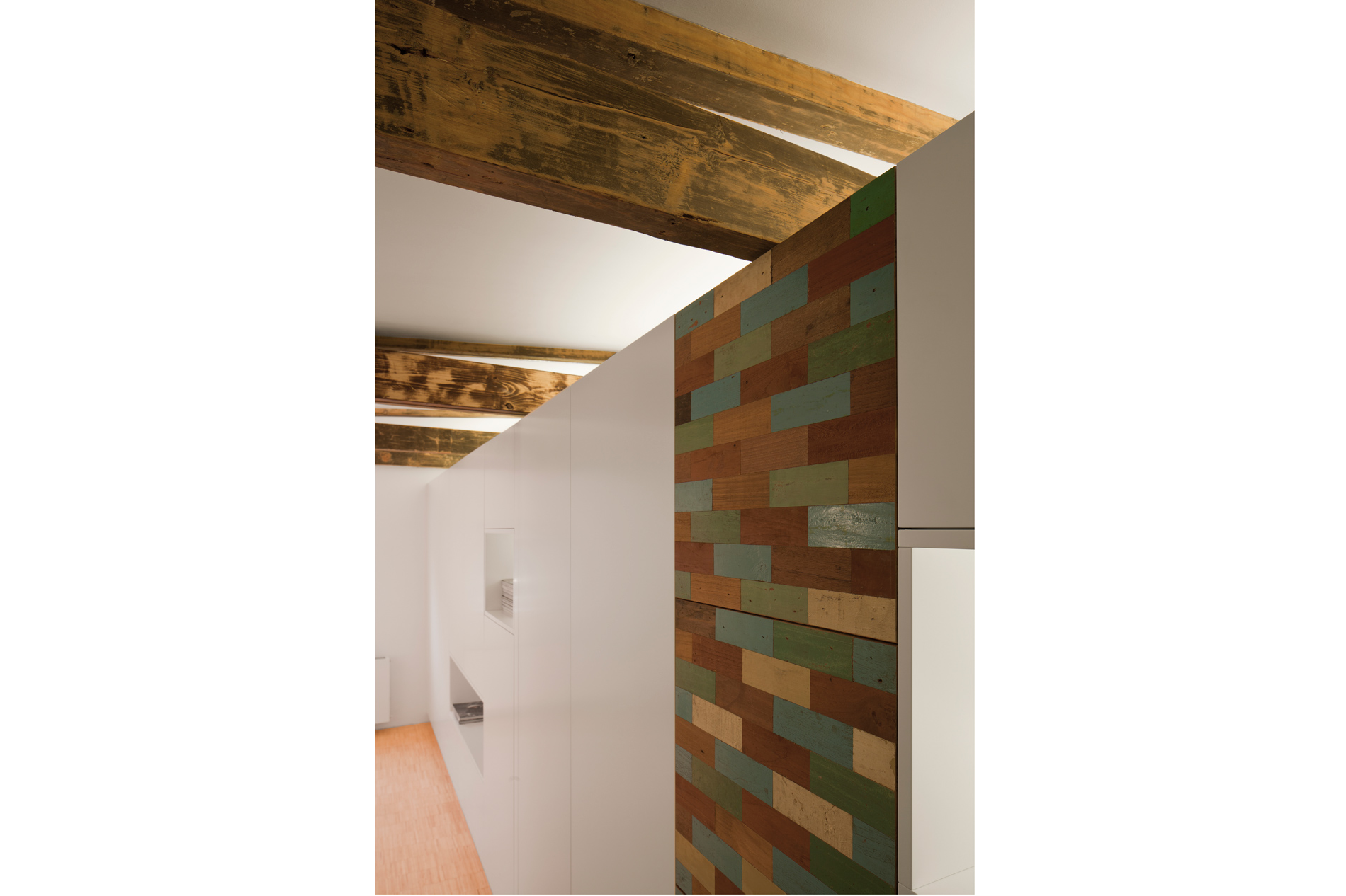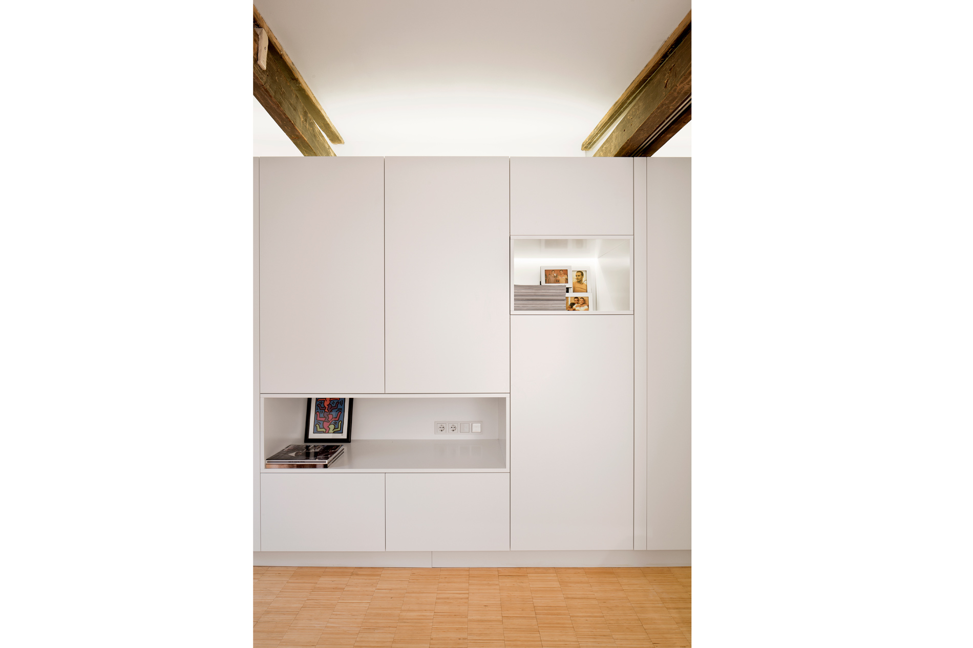 An eleven meter long closet has been designed to be used as storage and a wardrobe. The existing colorful closet has been used to define the height of the closet and to break the long white line of the new furniture. Frameless doors and plinths flush with walls contribute to perceive the space as a sequence of pure and sharp surfaces.