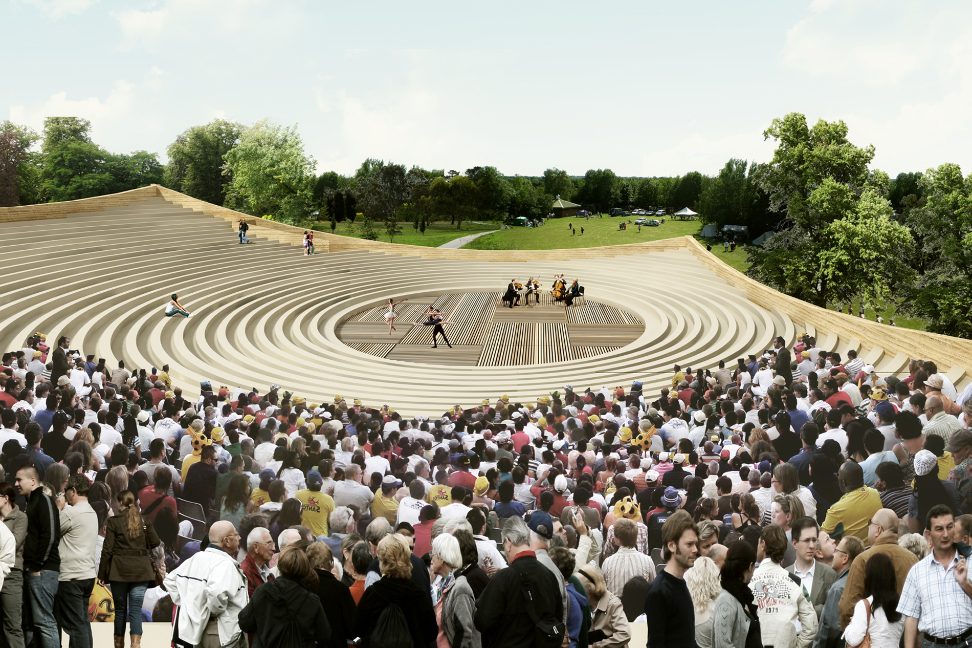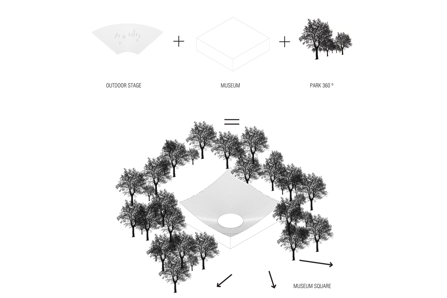 In order to diminish the amount of trees to be tear down, we decided to place the stage on top of the museum. The resulting shape, derived from its function, could work as an eye catcher and could awake curiosity among many visitors of the park. We propose a simple volume, a cube of 60x60m, with a very clear grid. The only alteration is the roof. Its shape is based on a carefully studied amphitheatre shape. Our proposal is timeless, it does not follow any trend, it is just a container with beautiful proportions and easy to be reconfigured.