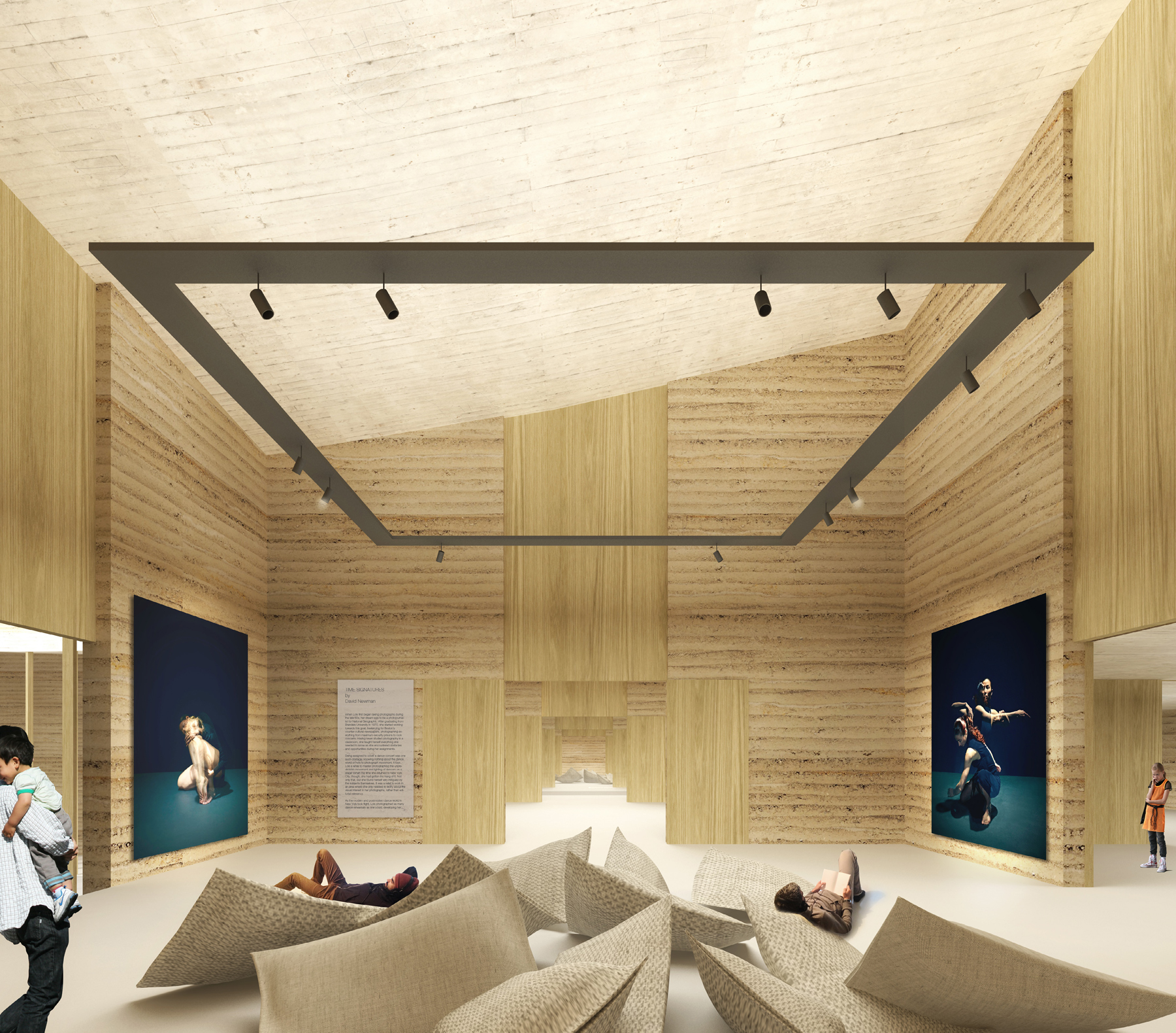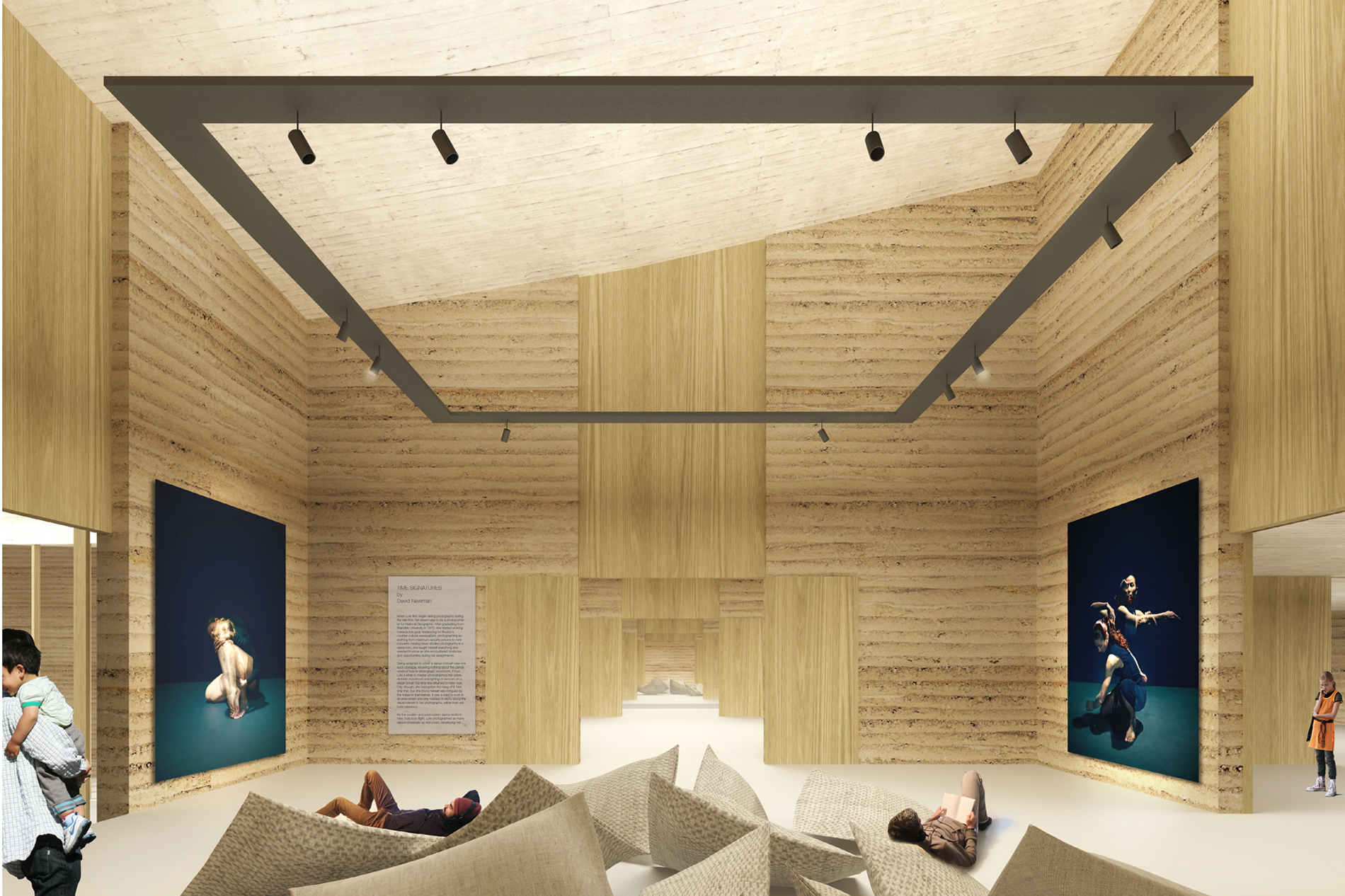 Material and construction | We propose to build the New Museum with rammed earth construction. Rammed earth can effectively control humidity where unclad walls containing clay are exposed to an internal space. Humidity is held between 40% and 60%, the ideal range for asthma sufferers and for the storage of such susceptible items as books. The material mass and clay content of rammed earth allows the building to ‘breathe’ more than concrete structures do. Due to this we are avoiding condensation issues without significant heat loss. Rammed earth is a popular choice for buildings where temperature fluctuations need to be kept to a minimum, such as a Museum. Furthermore internal walls of rammed earth are extremely useful in providing sound insulation between areas with different needs.