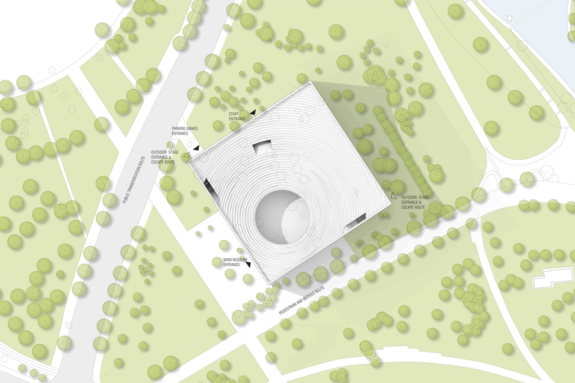 Location | The new Museum is located in a privileged area. It is located on the crossing road from all new museums and at the same time it is immersed in the park, in a quiet and green room. We are asked to design a museum and an outdoor stage in a relatively small plot full of trees.