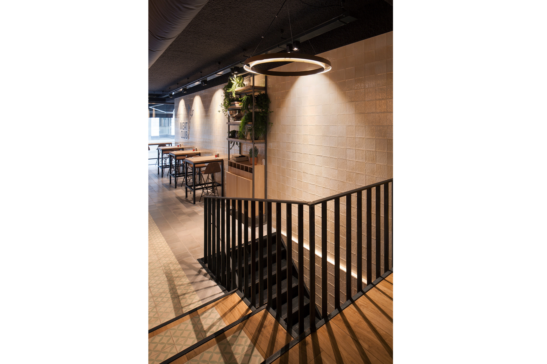 The ground floor is divided into two zones which offer the guests both lively and more intimate atmosphere to dine in. Either way, warm lights support the cosiness of the restaurant.