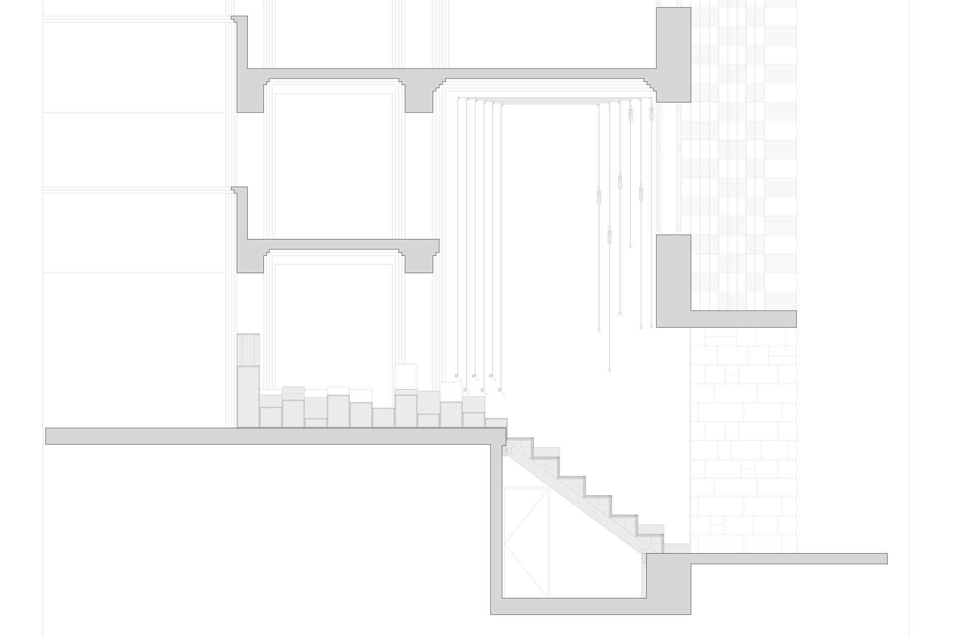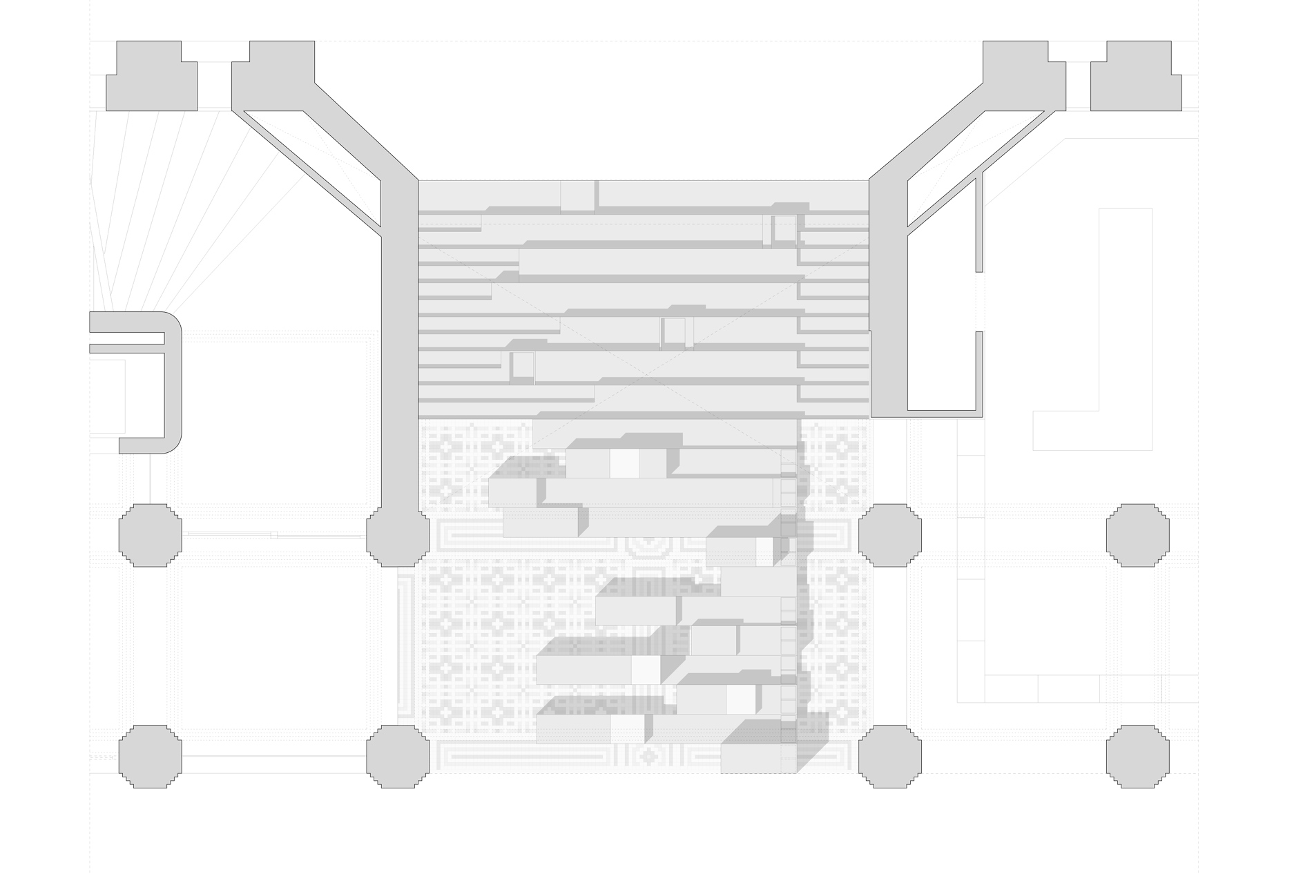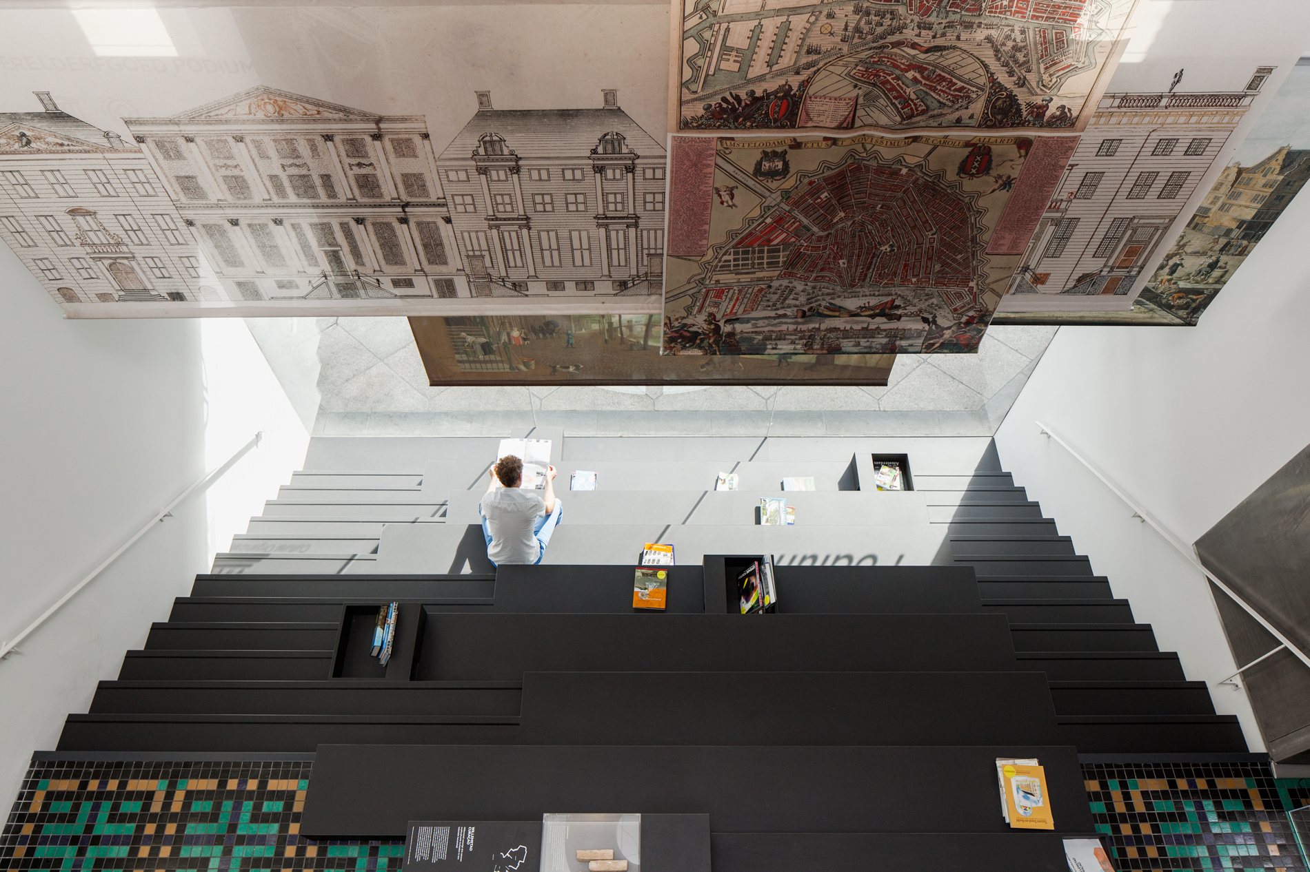 A series of banners with prints of historical paintings and maps of the Amsterdam Canal District are hung from the double height space above the podium. One banner functions as a projection screen and when lowered the podium turns into a small auditorium.
